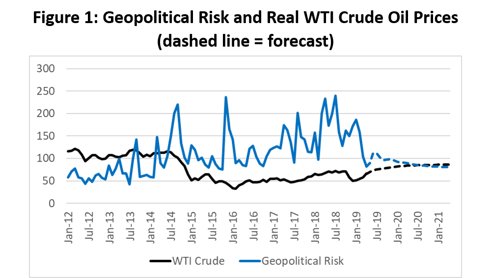 Because supply disruptions may be related to geopolitical risk, we decided to see how political and economic uncertainty affect a forecasting model for crude oil. We consider both U.S. economic policy uncertainty, and Caldara and Iacoviellos’ (2017) measures of geopolitical uncertainty for the world, Saudi Arabia, and China.