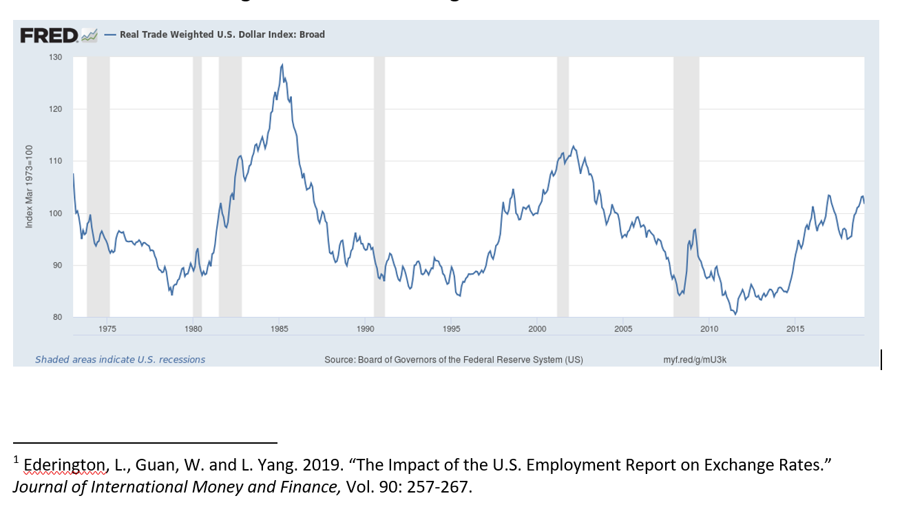 Exchange Rates’ Weak Response to Strong Employment Report Hints at Overvalued Dollar The January U.S. employment report showed 304,000 jobs added. By beating markets’ expectations of only 170,000 jobs by 134,000 jobs, it is one of the biggest employment surprises in several years. The dollar, however, exhibited atypically small responses against the other major floating currencies (the yen, pound, and euro), and this adds some support to our view that the dollar has more downside than upside potential in 2019.