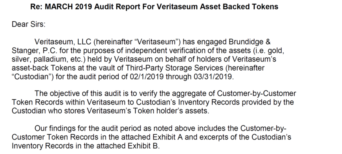 Veritaseum, LLC (hereinafter “Veritaseum”) has engaged Brundidge & Stanger, P.C. for the purposes of independent verification of the assets (i.e. gold, silver, palladium, etc.) held by Veritaseum on behalf of holders of Veritaseum’s asset-back Tokens at the vault of Third-Party Storage Services (hereinafter “Custodian”) for the audit period of 02/1/2019 through 03/31/2019.