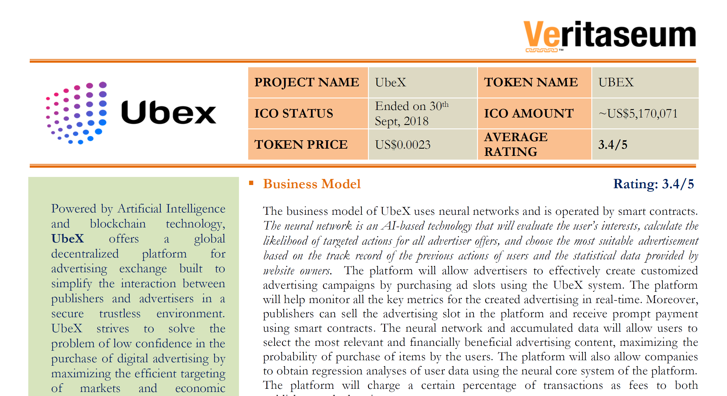 Powered by Artificial Intelligence and blockchain technology, UbeX offers a global decentralized platform for advertising exchange built to simplify the interaction between publishers and advertisers in a secure trustless environment. UbeX strives to solve the problem of low confidence in the purchase of digital advertising by maximizing the efficient targeting of markets and economic efficiency for advertisers by using fully operational neural networks and smart contracts.